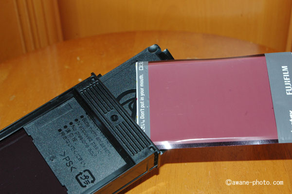 チェンジバッグ内などの暗黒環境下で,「チェキ」フィルムのカートリッジから指で押し出して,フィルムを抜き出す。 「チェキ」フィルムのカートリッジで,いちばんうえに入っているのは,遮光用の板である。フィルムを抜き出したあとは,遮光用の板をもどして「チェキ」カメラにセットしておけば,不用意に露光させてしまうこともない。