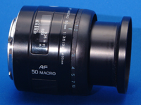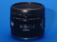 ミノルタαシステム用の単焦点マクロレンズ(接写用レンズ)には,等倍までの撮影に対応した50mm F2.8のものと100mm F2.8のものとがラインアップされていた。このレンズは1/2倍までの撮影に対応した,それらにくらべて廉価なモデルとして発売されている。日本カメラショー「カメラ総合カタログ」では,vol.108 (1994年春)で「1994/4下旬発売予定」としてはじめて掲載された。そののち,コニカミノルタになって後のvol.120 (2004年)まで掲載されている。