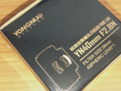 Shenzhen (深セン市)のYONGNUO (永諾) が,2018年のCP+で新製品として紹介したレンズである。フィルタ径は58mmで太く感じるレンズであるが,全長は短く,いわゆるパンケーキレンズ風の印象を受ける外見をしている。また,レンズはとても軽く,小型のボディと組み合わせたときのバランスがとてもよい。軽い一方で,先にも書いたように径が太いため,大型のボディと組み合わせても,案外と似合うものである。 このレンズの外見は,キヤノンEOSの40mm F2.8レンズに似ている印象がある。また,レンズ構成はいちばん後ろに非球面レンズを置いた4群6枚構成で,この面でもキヤノンEOSの40mm F2.8レンズに似ている。
