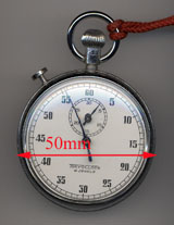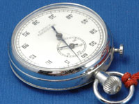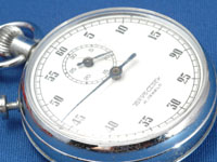 機械式のストップウォッチである。小さな分針は30分まで目盛があり,秒針は1周で60秒になっているので,通常の時計と違和感なく読み取ることができる。上部中央の大きなノブは,ゼンマイを巻き上げるためのものである。また,押すことで,スタート/ストップを操作できる。横にある小さなボタンは,分針と秒針とを0に戻すためのものである。
